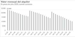 En los meses en los que se hace el ajuste anual, el economista ilustra que “el precio del alquiler llegó a representar 96% (2021) y 90% (2022)” del valor real de la primera cuota. Indica que en los 11 meses siguientes la capacidad de compra de la cuota cae y “el mes 36 de alquiler representa el menor valor de los tres años: 43% del valor inicial. Por ejemplo: lo que en junio de 2023 cobra el propietario representa $10.216 de los $23.500 iniciales”. En otras palabras, con el último mes de alquiler del contrato el dueño puede comprar menos de la mitad de las cosas que compraba tres años atrás por alquilar esa misma unidad al mismo inquilino.
